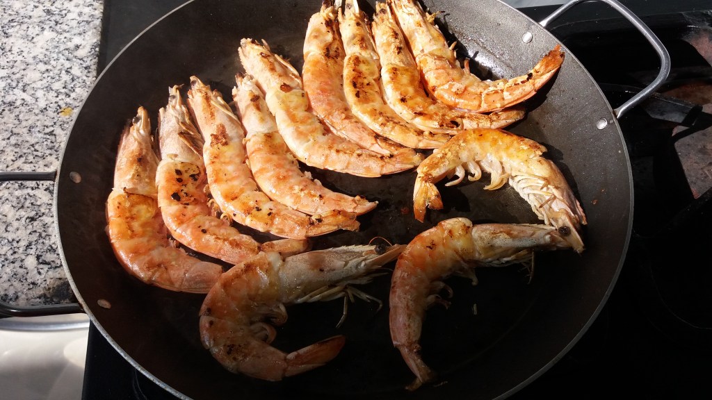 – Adicione azeite na paellera e frite os camarões grandes com casca brevemente (2 minutos). Reserve