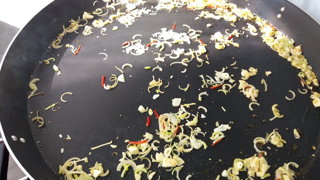 – Frite os camarões grandes sem casca brevemente, retire e reserve.