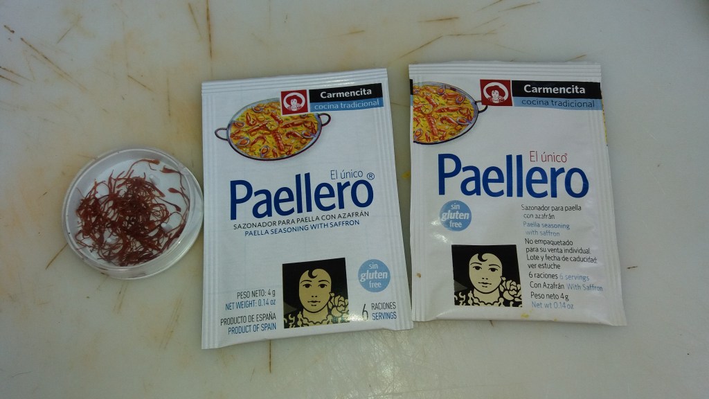 – Caldo– Preparar o caldo conforme disponibilidade, se tem as cascas dos camarões, utilize-as; se tem um caldo de peixe ou caldo de legumes, ótimo; se não tem usar 2 tabletes de caldo de legumes. Depois de coado, com ele quente, acrescentar os envelopes de paellero e um pouco antes de jogar o caldo na paella, acrescentar os pistilos.