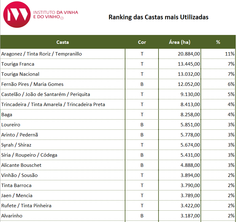 Touriga Nacional, Baga, Tinta Roriz/Aragonês, Tinta amarela/Trincadeira, Castelão, Alfrocheiro, Alvarinho, Arinto, Encruzado e Fernão Pires/Maria Gomes, alem de outras, são um verdadeiro tesouro ampelográfico para o mundo.