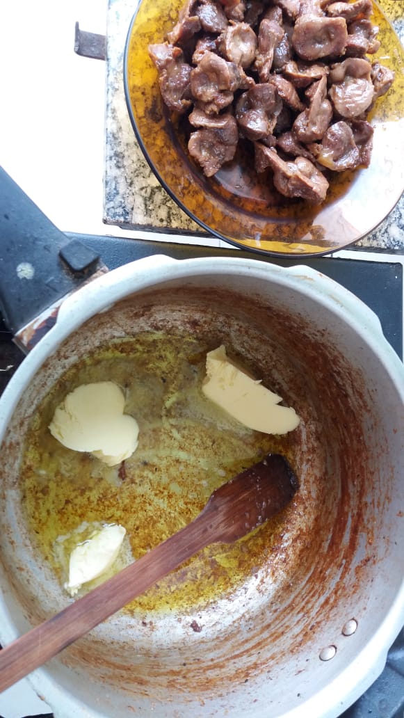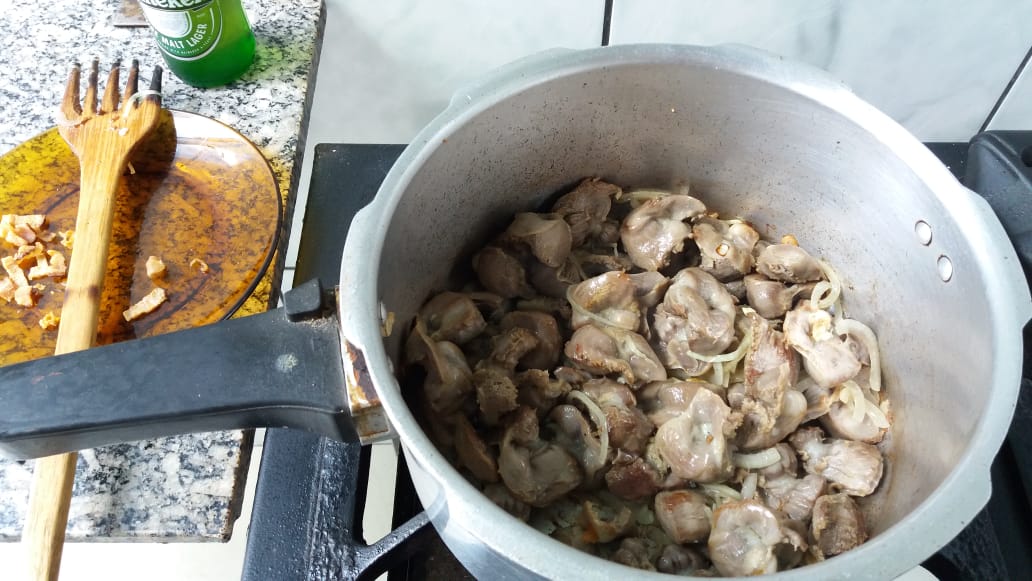 – Frite bem até dourar as moelas, adicione a cebola picada e refogue um pouco.