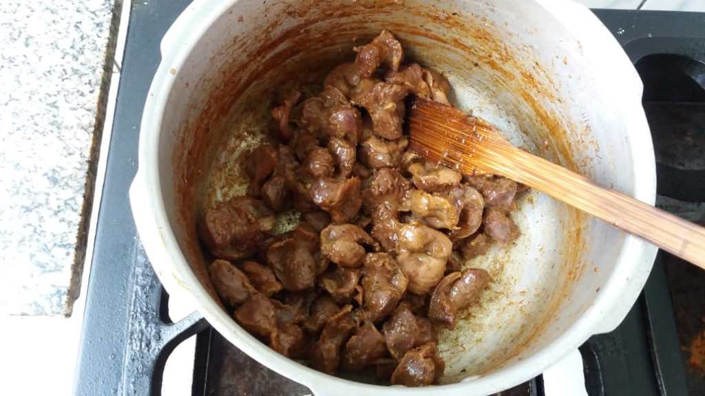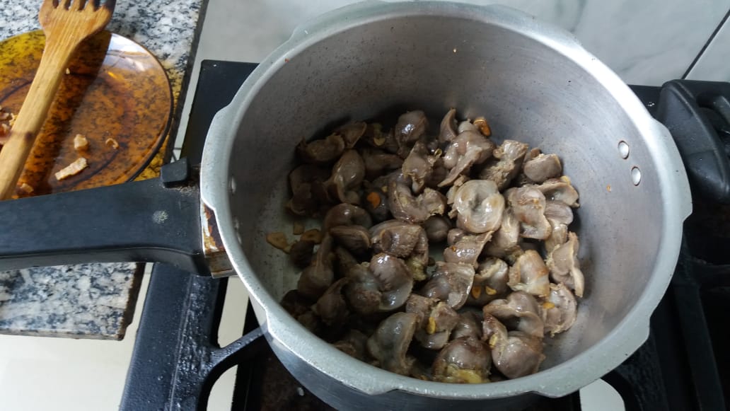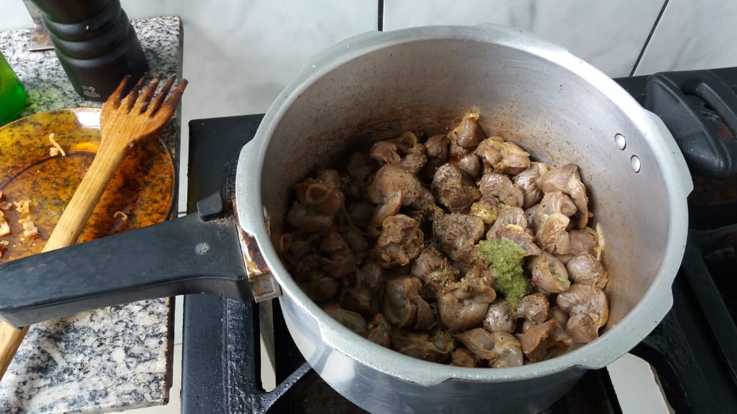 – Juntar agua até cobrir e fechar a panela de pressão, cozinhando por aproximadamente 20/30 minutos; se a moela estiver ao dente retire a tampa e deixe cozinhar até secar a agua. Retire e reserve