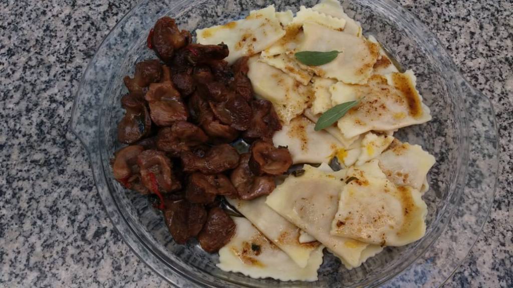 Servir os tortei com as moelas e uma folha de salvia para decorar.