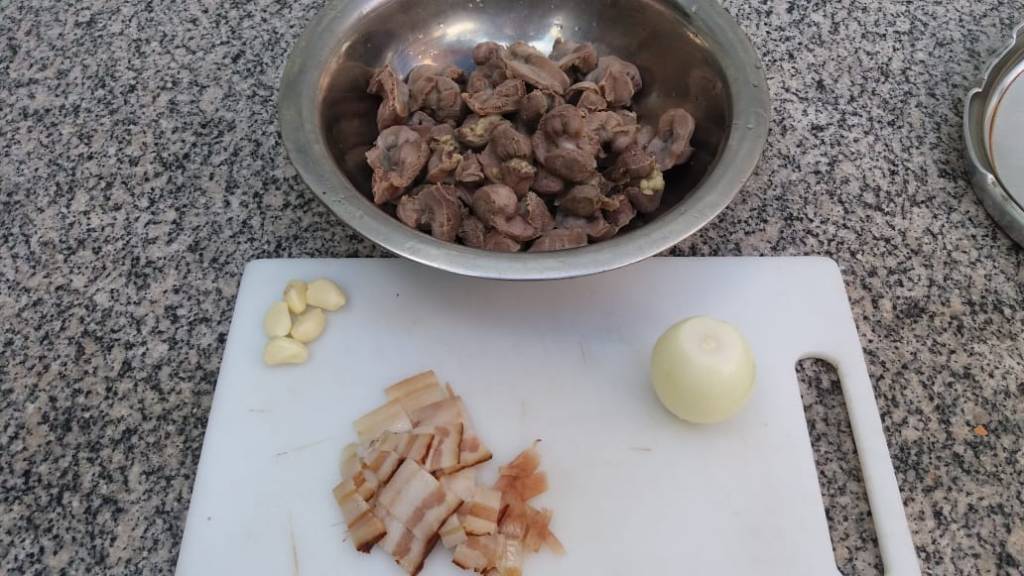 – Na gordura do bacon frite o alho laminado e adicione as moelas escorridas.