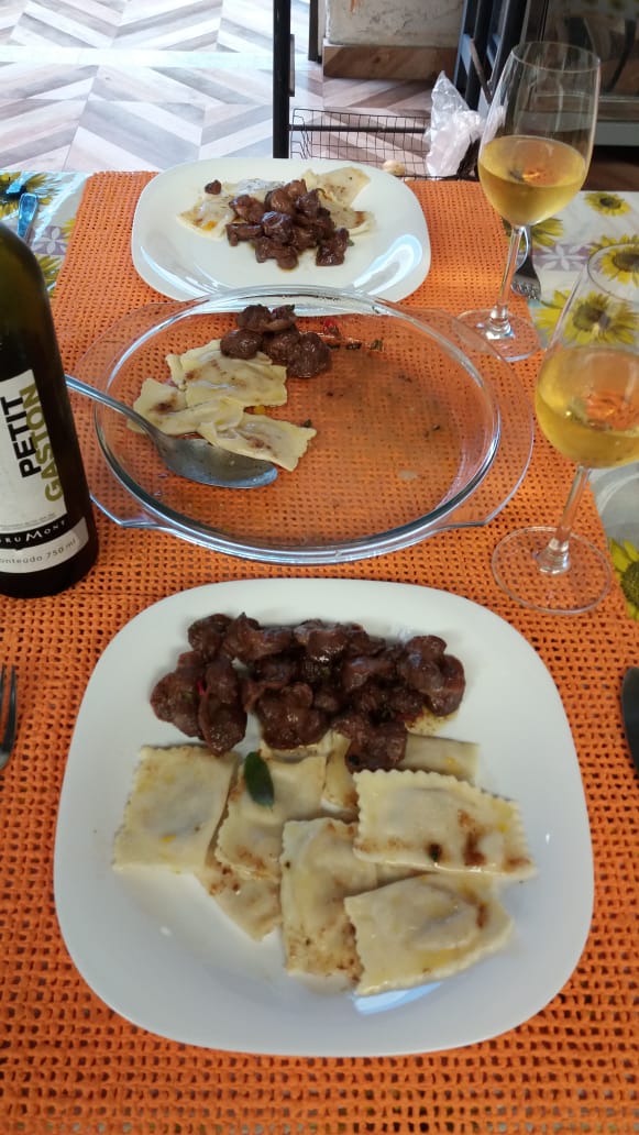 Harmonizou mais só com o Tortei e molho de salvia, a moela passou dele; talvez o Daumas de Gassac Blanc tivesse a altura do prato, outros dois vinhos que lembrei foi o Haas Manna e Caymus Conundrum White.